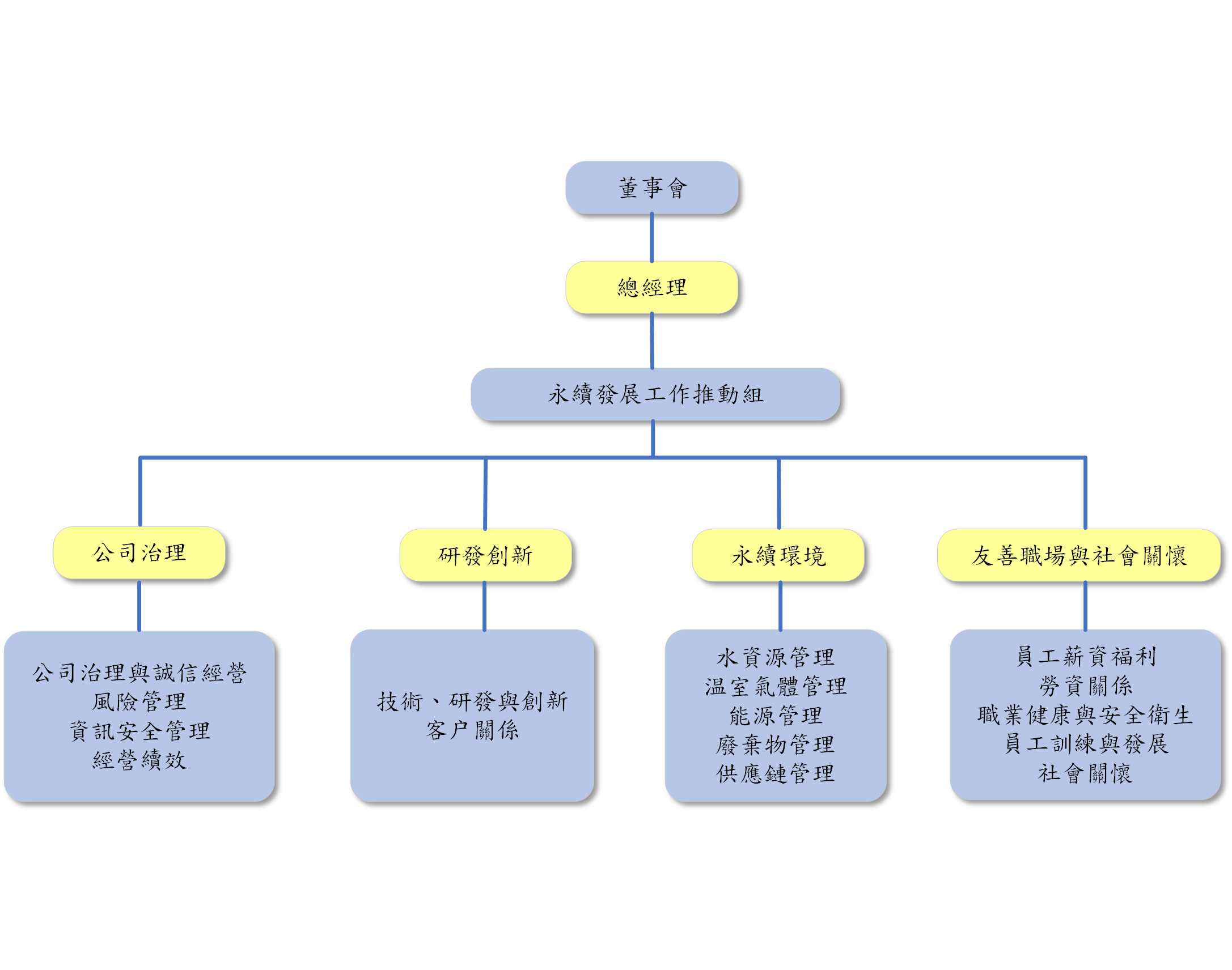 為落實及執行企業社會責任政策,實現永續發展之目標,由跨部門成員包括總經理室、稽核室、財務處、人力資源處、資訊管理處、產品事業處及行銷業務處等單位,組成「永續發展堆動組」之任務組織,定期召開會議,設定目標及討論執行方向,並由總經理擔任永續發展工作組召集人,統合公司資源,依循永續發展實務守則,朝向四大構面:落實公司治理、發展永續環境、維護社會公益、加強永續發展資訊揭露,推行各項工作及檢視成效,永續發展工作組於114/1/14、114/3/4、114/8/5向董事會報告,並於114/8/5經董事會通過發行永續報告書,讓利害關係人瞭解公司永續發展的進程與成果。