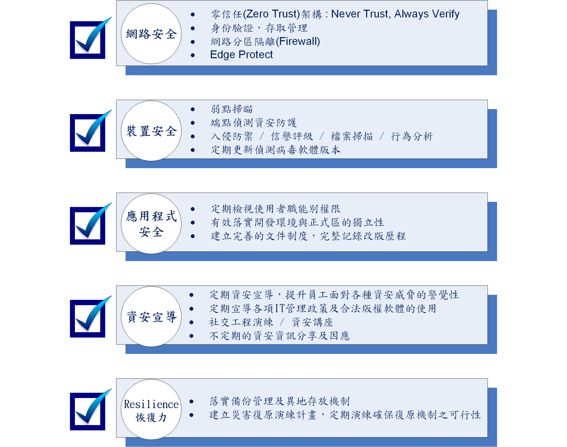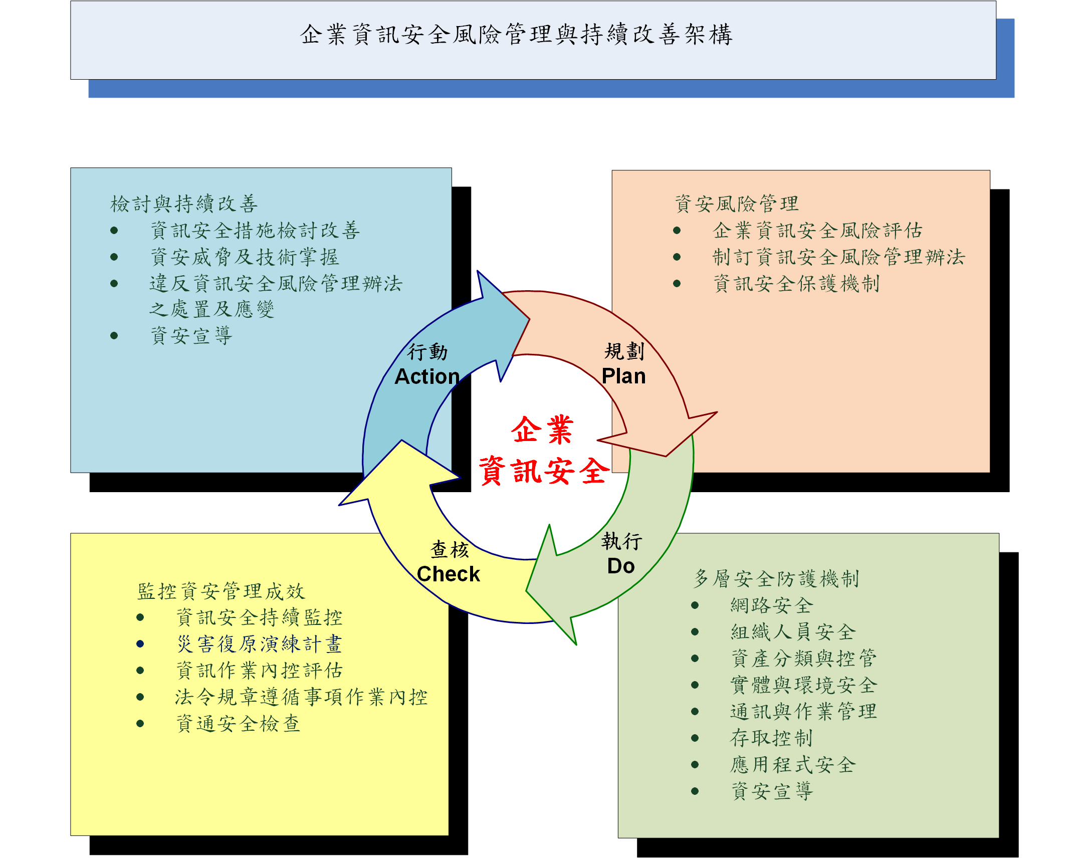 為執行企業資訊安全組織訂定的資安策略,確保內部遵循資安相關準則、程序與法規,特別成立『資訊安全專責單位』,並委由資訊管理處擔任,指派資訊安全主管及資訊安全人員,安排專業資訊安全外訓課程。